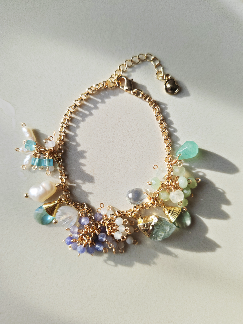 This bracelet is a gentle ode to calming waters and soft morning light. A harmonious blend of blue and green gemstones creates a soothing palette that feels fresh, airy and effortlessly elegant. Each charm is hand-assembled on a warm gold toned chain, moving delicately with every gesture.