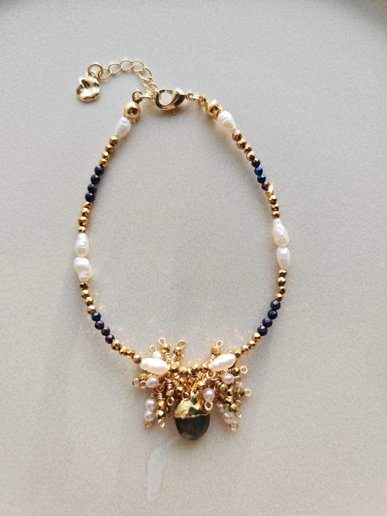 Accents of gold-plated hematite add grounding elegance, catching the light with every gentle movement. The contrast of iridescent stone, deep blue gem, warm gold, and soft pearl creates a piece that feels both luxurious and quietly enchanting.